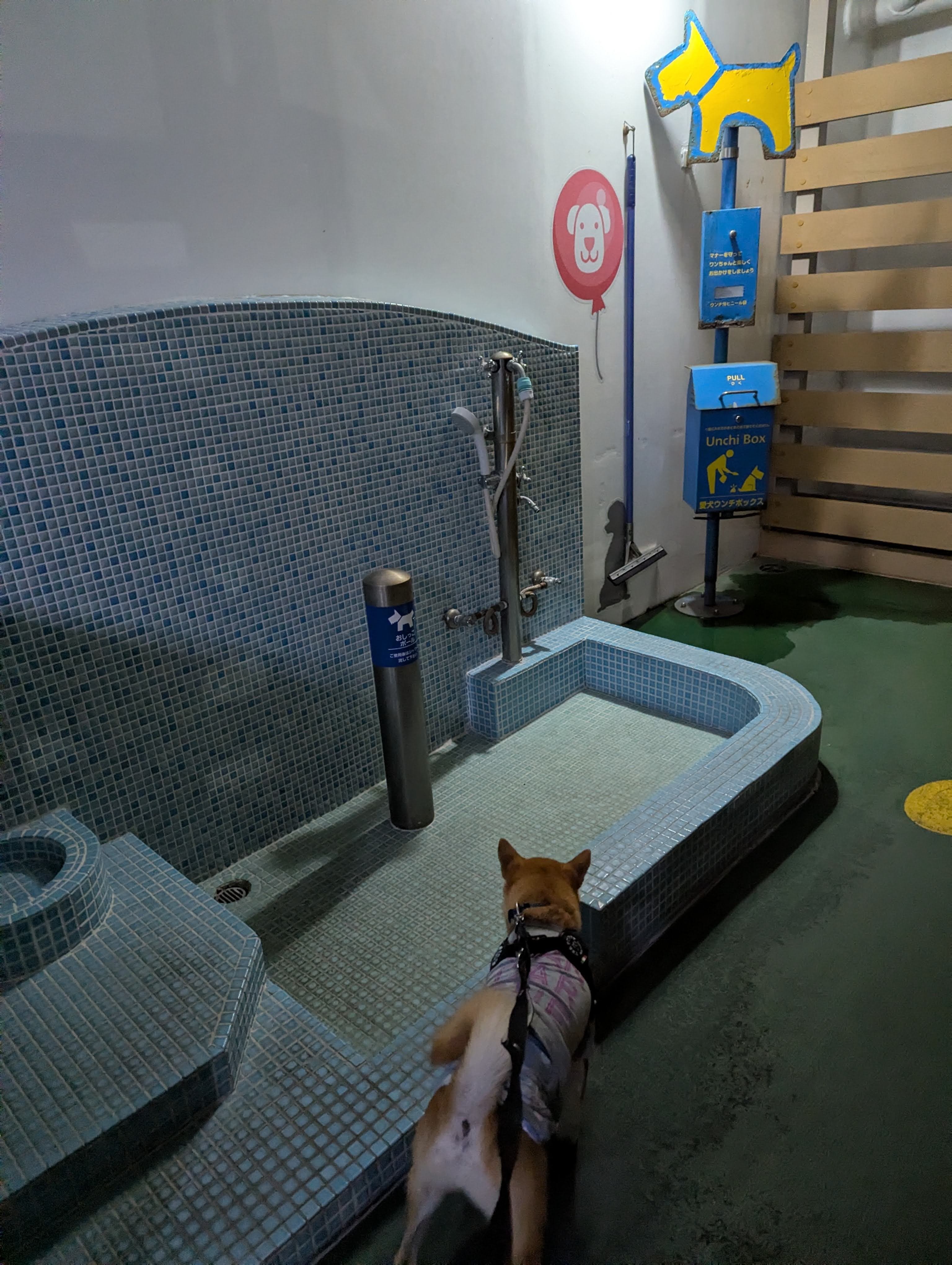 こじんまりした外を感じられるスペース。おしっこをするために気分転換にウロウロ…といった場所。ウンチゴミ箱、水を流すジョウロなどもありました。数回出たけれども他のワンちゃんとは会わず。