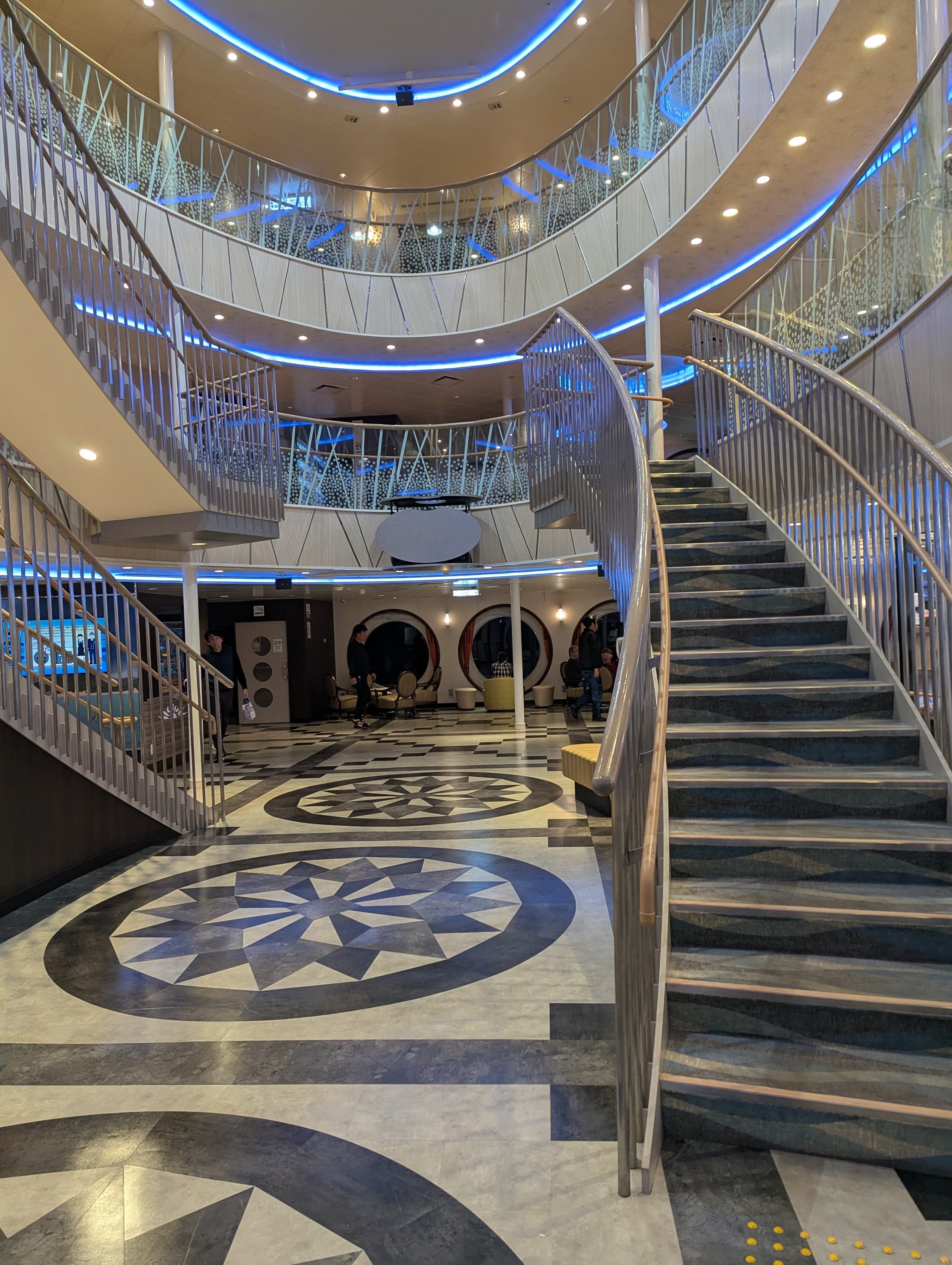 プロジェクトマッピングやジャズ生演奏が行われ、自販機にお酒を買いに行きつつ、ジャズを聴いて…近くで聞いている人、上階でゆっくり楽しむ人、仲間でお酒を飲みながら、などアットホームな雰囲気でした。下船案内、レストラン営業終了、今からおにぎり販売します…(朝食)なども船内放送で随時流れます。