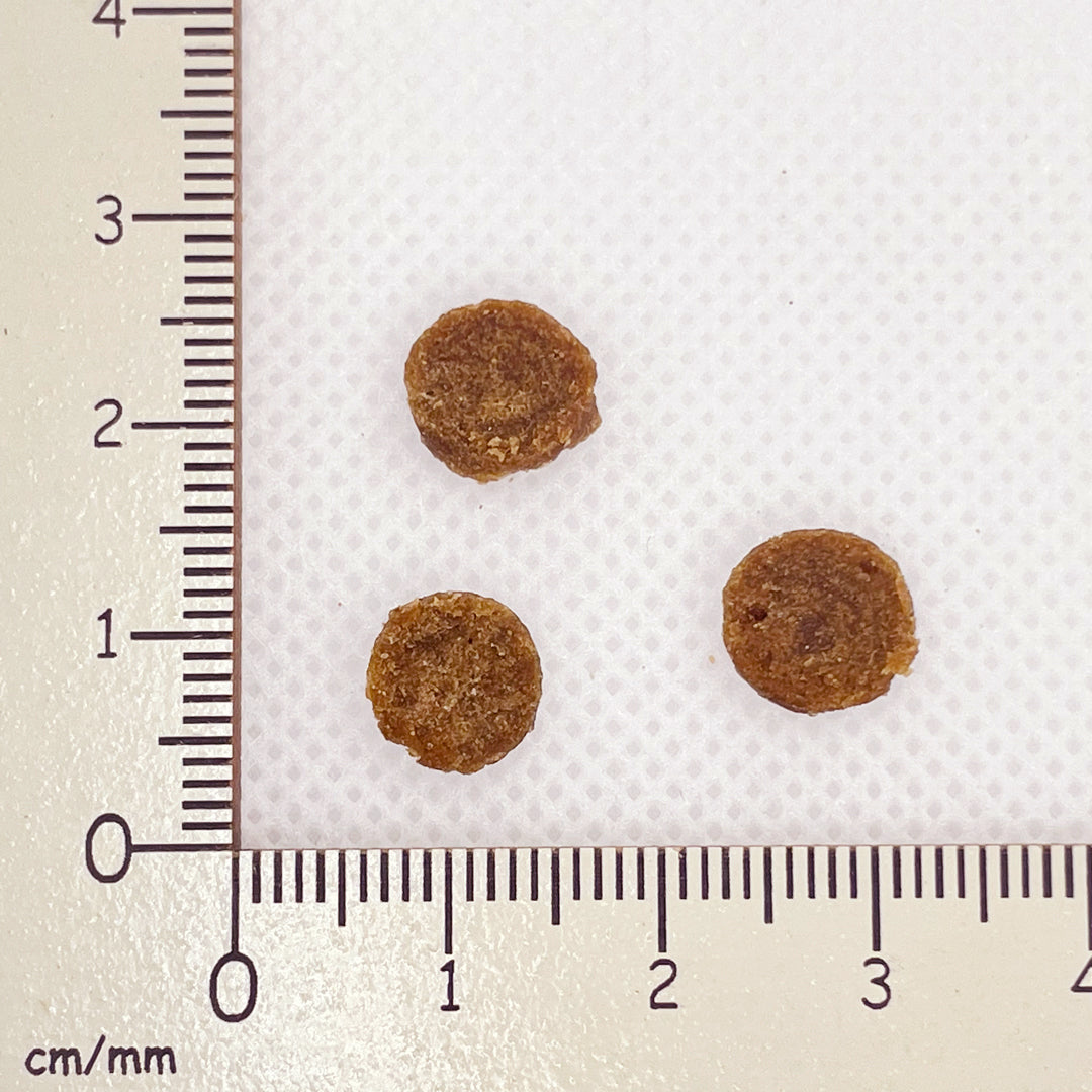 ・成分値:粗タンパク質 18.5%以上、粗脂肪 7.6%以上、粗繊維 0.8%以下、粗灰分 5.2%以下、水分 30.0%以下