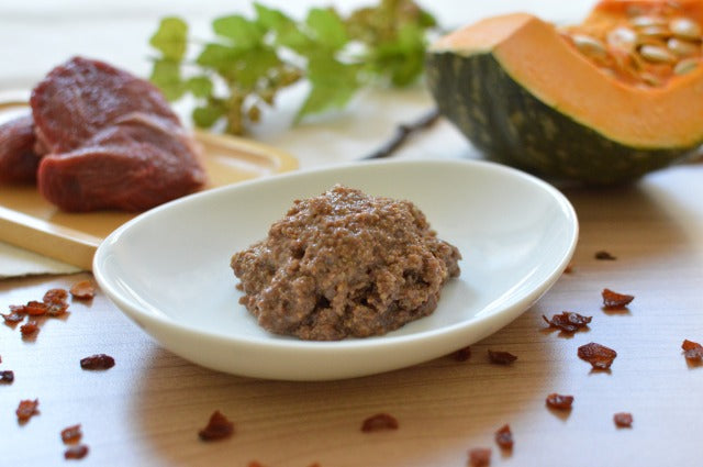 健康の維持に欠かせない良質なタンパク質、鉄、亜鉛などのミネラルもバランスよく含まれているビーフに、秋の香りを添えるローズヒップを合わせて仕上げました。豊富なビタミンとミネラルを含むアマランサスとグルコサミノグリカンやオメガ‐3脂肪酸が豊富な緑イ貝が、身体の動きを整えるサポートをします。夏の暑さにバテ気味、季節の変わり目の食いつきアップにおすすめの一品です。増粘安定剤・発色剤・着色料不使用。ペースト状で食べやすく、トッピングで簡単に豪華なごちそうが出来上がります。