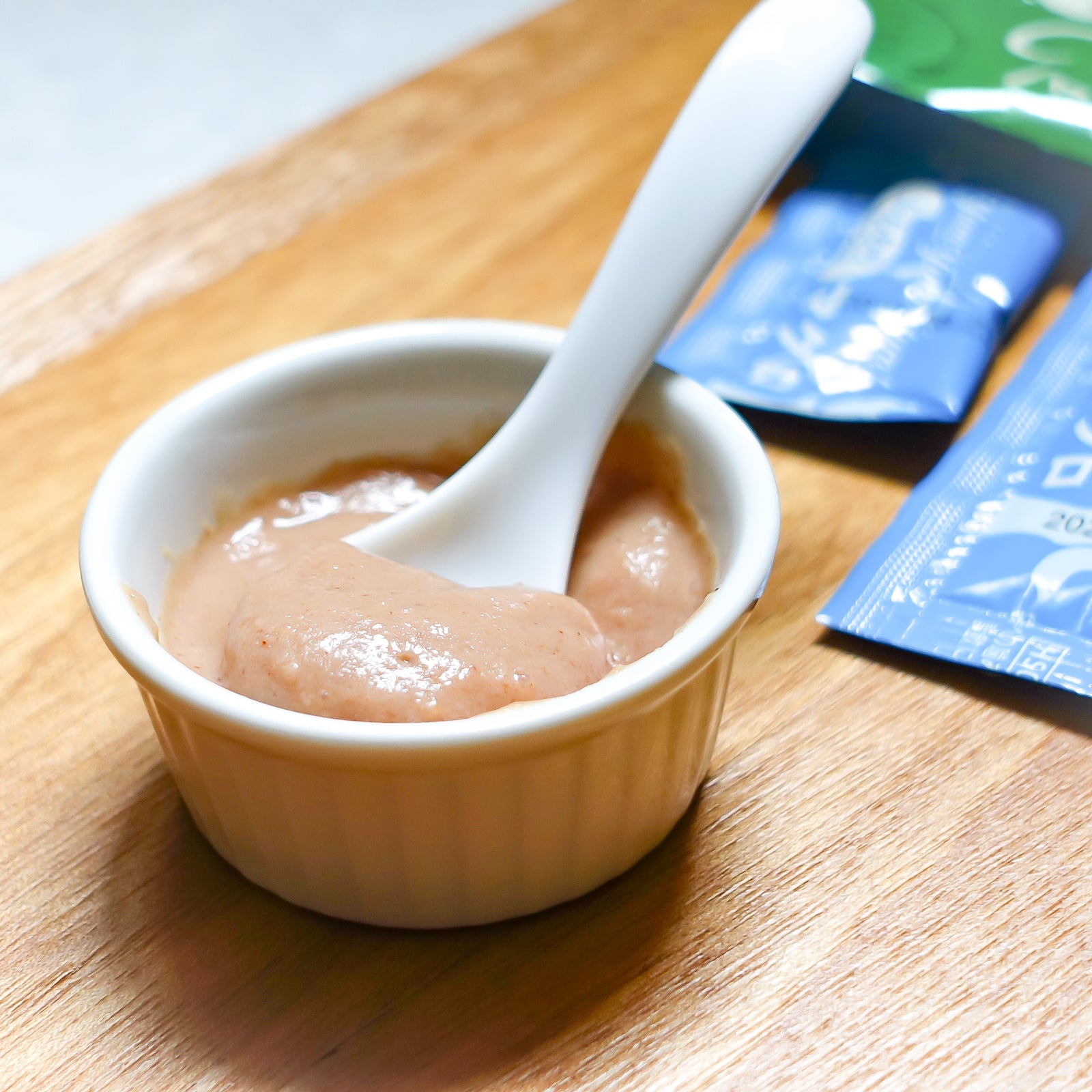 夏場は冷やしたり凍らせるのもおススメ!なめらかな食感で、なかなか水を飲まない時にサッと与えられて本当に便利です。旅行や遠くへ出かけるときに必ず持っていく必需品です。トッピング・おやつ・水分補給に大活躍です。シニア犬にも◎