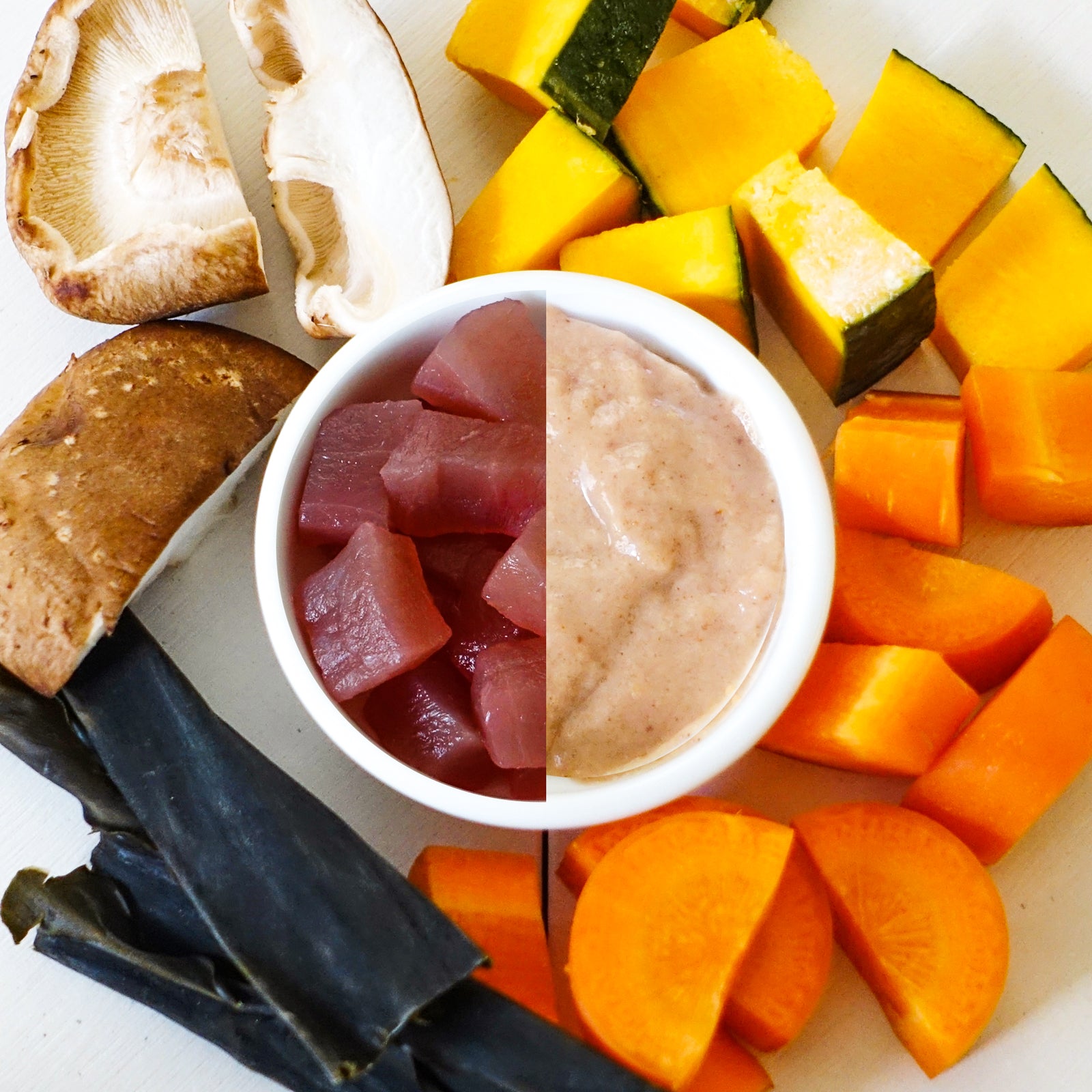 ・原材料:魚類(マグロ、カツオ),コーンスターチ,かぼちゃ,にんじん,カツオパウダー,しいたけエキスパウダー,昆布エキス,こんにゃくパウダー,寒天